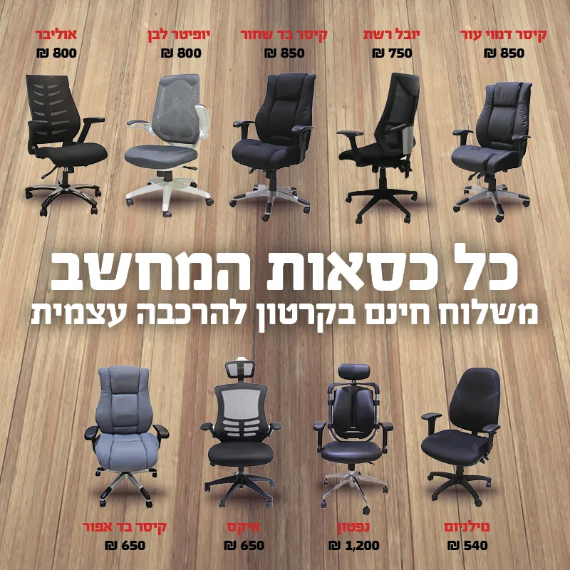 כחברה הוותיקה ביותר בישראל בתחום הריהוט המשרדי מאז 1950, אנחנו מקפידים על שירות אישי וקשוב, אספקה מהירה וייעוץ בהתאמה של כסאות מחשב לצרכים שונים. אתם מוזמנים לבחור בכסא המתאים לכם ביותר, להזמין אותו מהאתר בלחיצת כפתור, וליהנות מתנאי עבודה נוחים ויעילים. לכל שאלה, אל תהססו לפנות לצוות המקצועי שלנו.